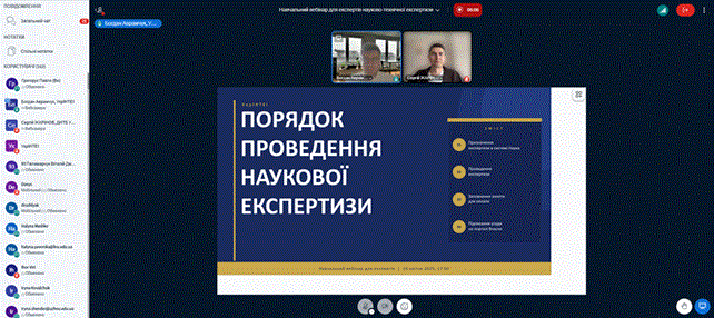 В ньому взяв участь завідувач кафедри проф. Павло Григорук. Спікерами виступили Богдан Аврамчук, заступник директора УкрІНТЕІ з експертної діяльності та Сергій Жарінов, представник Державної науково-технічної бібліотеки. В ході вебінару були розглянуті питання загального порядку проведення науково-технічної експертизи, оплати праці, особливостей проведення науково-технічної експертизи в Національній електронній системі «Наука».